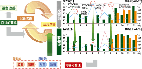 以往的設(shè)備節(jié)能是以「引進節(jié)能設(shè)備?機器?新技術(shù)」即設(shè)備改善為主體,是針對點的改善。三菱電機認為「依據(jù)可視化管理具體把握能量消耗的動向,做到庫華制冷適合化」這種通過可視化管理將設(shè)備改善與運用改善綜合鏈接的活動才是持續(xù)節(jié)能的重點所在。如圖所示: